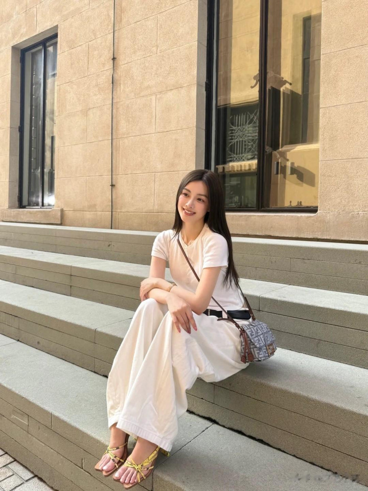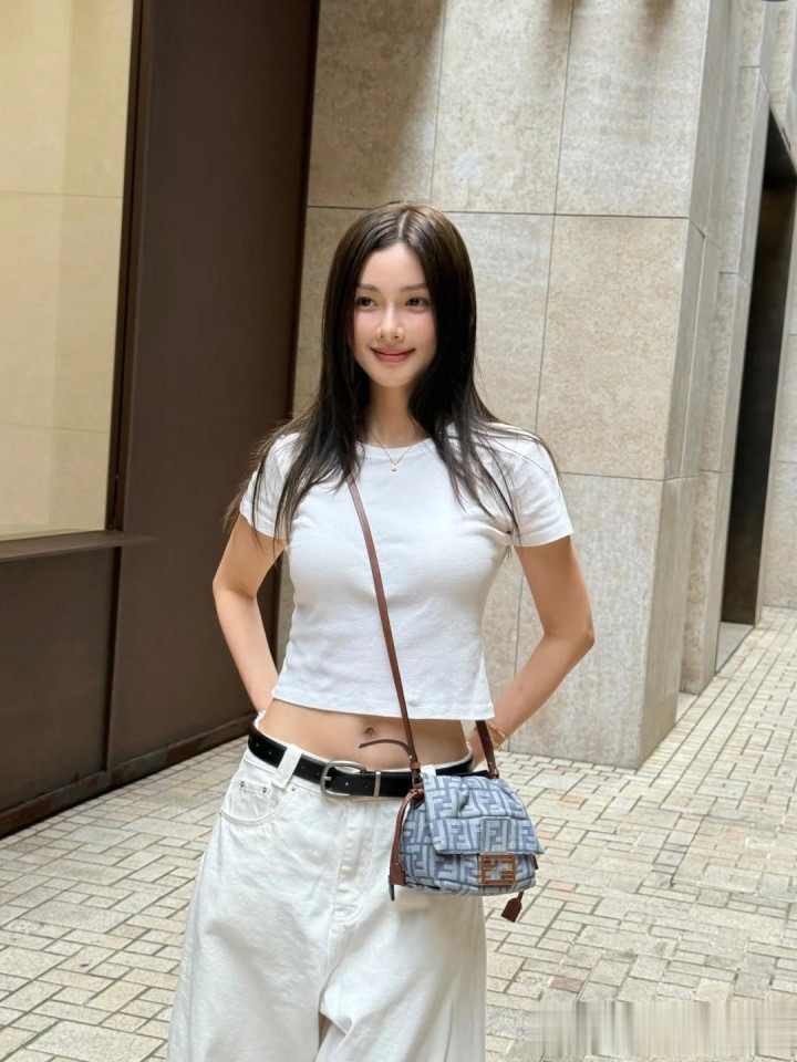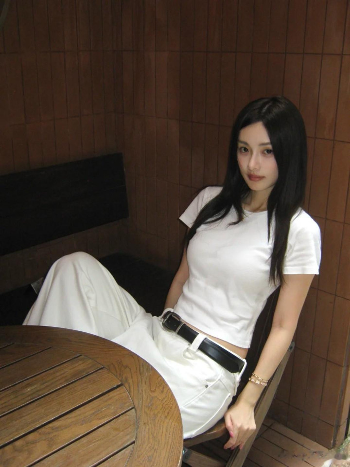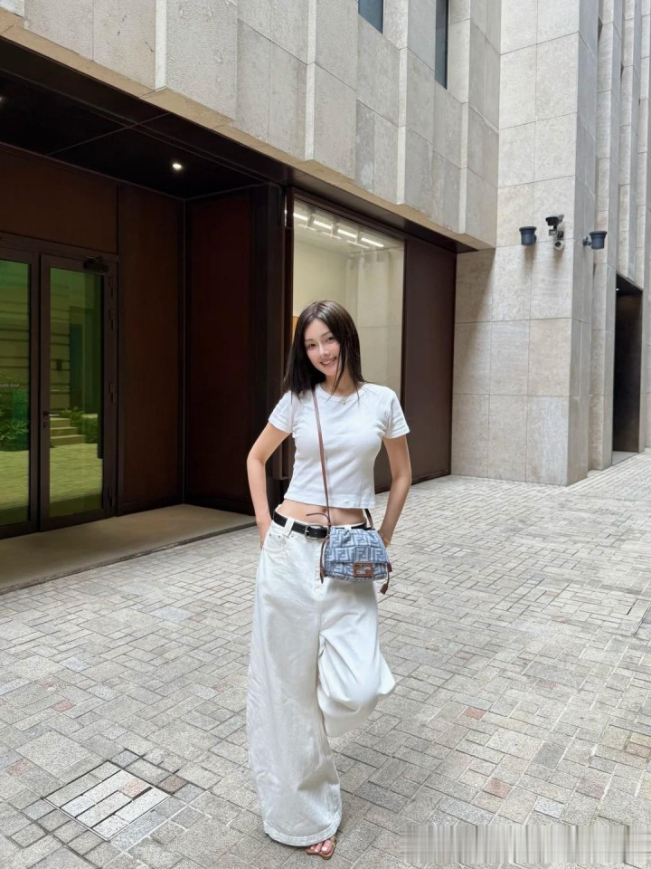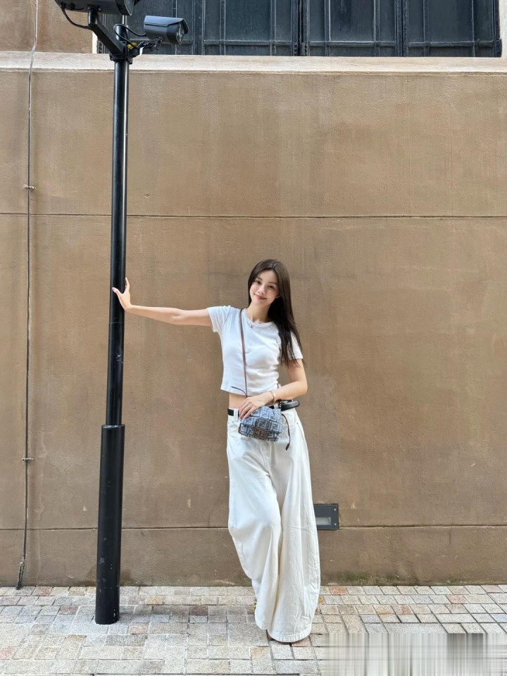 腰肢纤细,线条流畅,穿着简单的白色T恤和牛仔裤,却依然难掩好身材;双腿修长,小腿肌肉紧实,脚踝纤细,透着力量感。